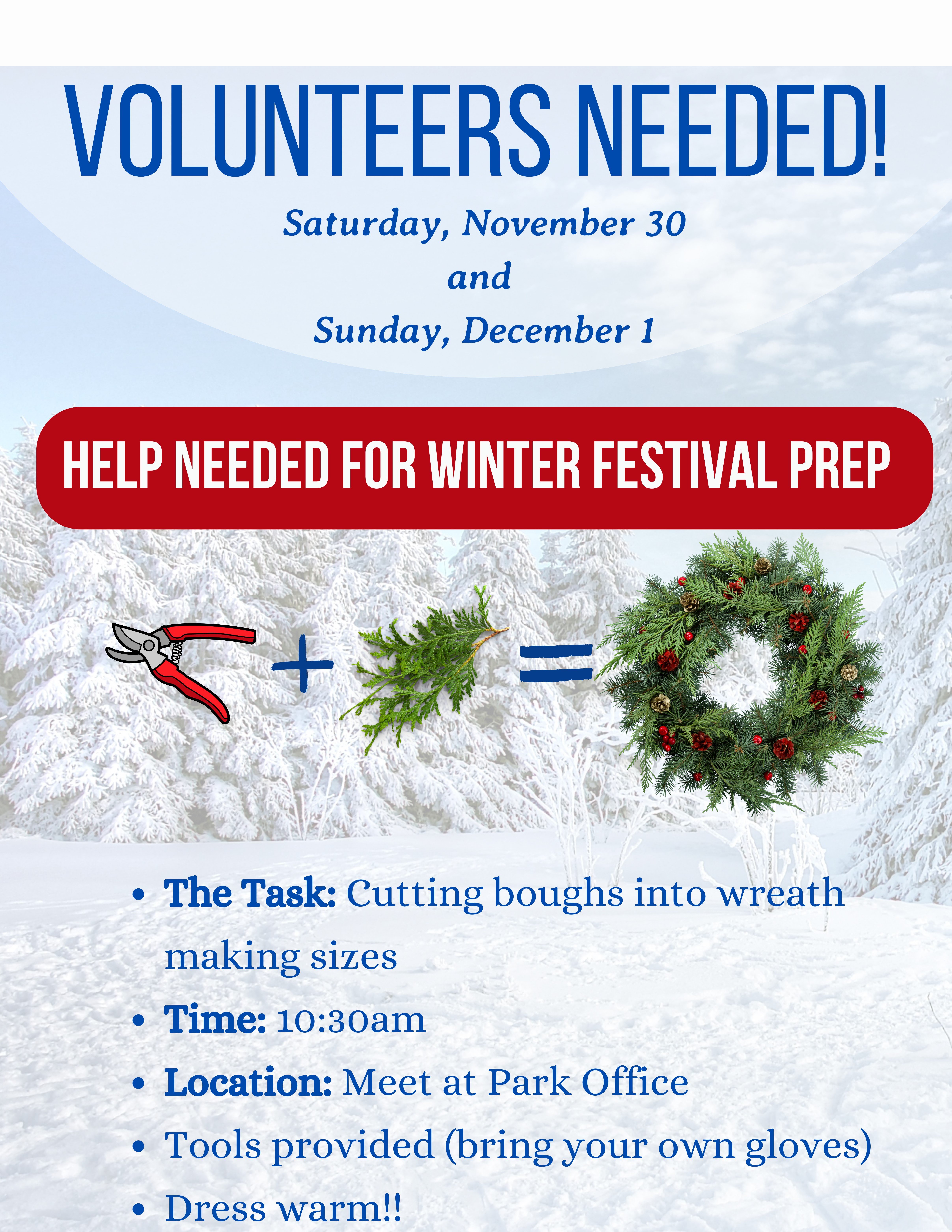 Cut branches into thousands of wreath -size boughs in preparation for the Winter Festival Wreath Making activity! We have the branches; we have the pruners; we need more hands!